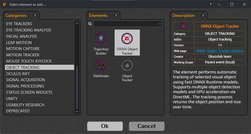 The element performs automatic tracking of selected visual objects using fast ONNX Runtime models and returns the object’s position, size, detection confidence, and processing time in real time—making it suitable for adaptive paradigms.
